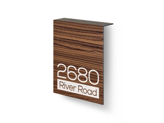 Modern Walnut Aluminium Address Sign - Personalized House Number Sign - Laser Engraved Street Name Plaque